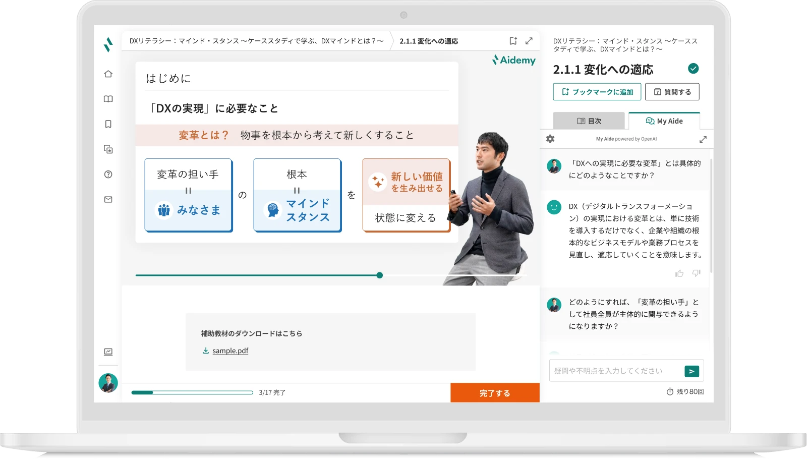 生成AIで業務効率化、Pythonプログラミングができる実務者から、Word・Excel・ITの基礎が分かる初学者までを人材要件定義、スキルアセスメント、研修設計、学習促進を一気通貫で伴走可能なAidemy Businessが育成します。