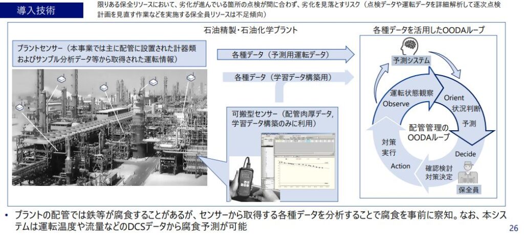 運転温度・圧力・流量などのデータをAIが分析し、腐食リスクが高い箇所を特定。点検対象を優先順位づけすることで、限られた人員でも効率的に保守業務を進められるようになっています。
