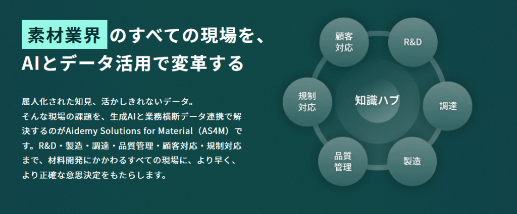 特に化学・素材業界向けの「Aidemy Solutions for Material」では、実験データや報告書、特許情報など社内に点在する知見をつなぎ、マテリアルズ・インフォマティクス(MI)や生成AI・RAGを活用して、研究開発・品質管理・製造の最適化を支援します。
