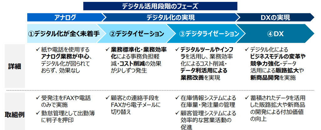 この段階では、業務や意思決定の仕組み自体は変わりません。「紙をデータに変える」「アナログをデジタル形式にする」といった単純な変換プロセスを指します。