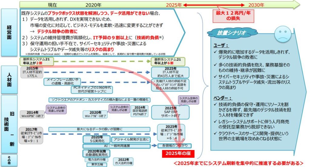 この中で指摘されたのが、「2025年の崖」と呼ばれる課題です。