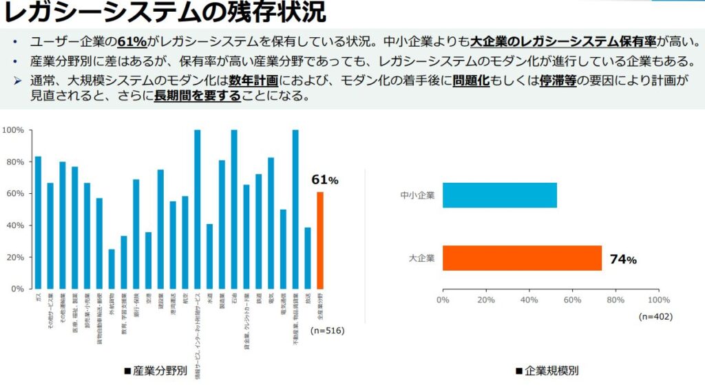 2025年5月28日の経済産業省がまとめた以下の資料によると、ユーザー企業の61%がレガシーシステムを保有している状況であり、中小企業よりも大企業のレガシーシステム保有率が高い状況です。