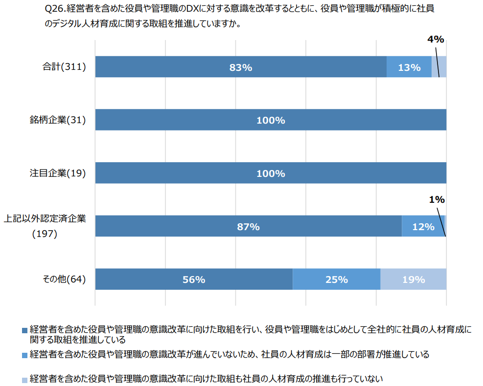 以下のように、DX銘柄企業では、デジタル人材育成に関する取り組みが100%で実施されています。