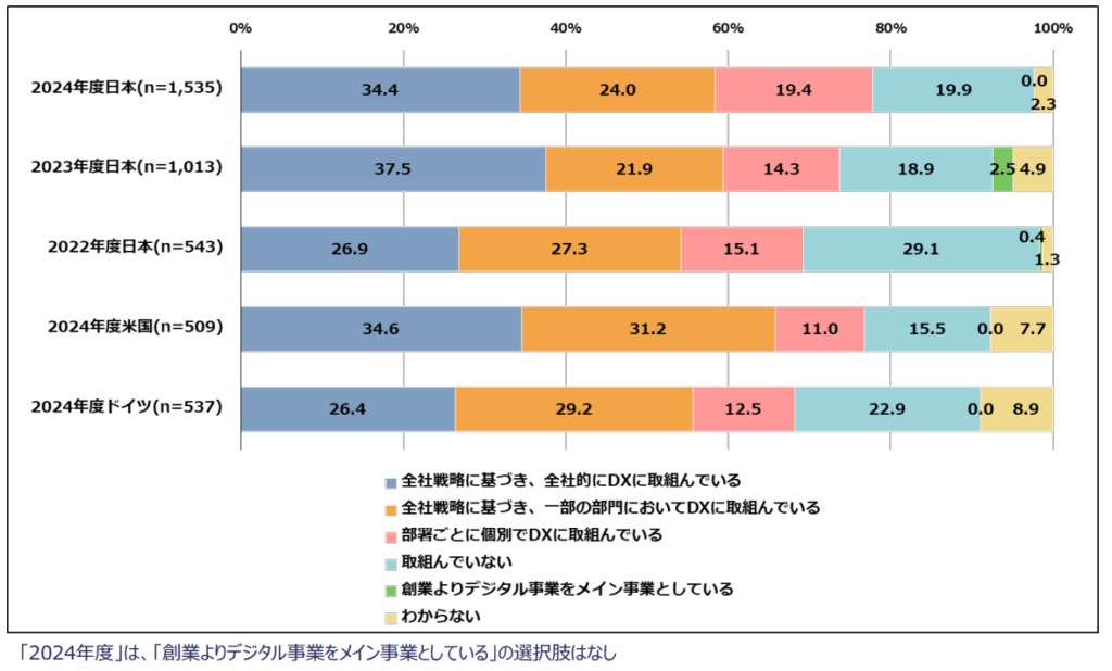 実は、2025年6月26日に独立行政法人情報処理推進機構が公開している資料の「DX動向2025(データ集)」によると、日本国内におけるDXの取り組みは年々増加しており、2024年度時点では、34.4%が全体戦略に基づき、全社的にDXに取り組んでいます。