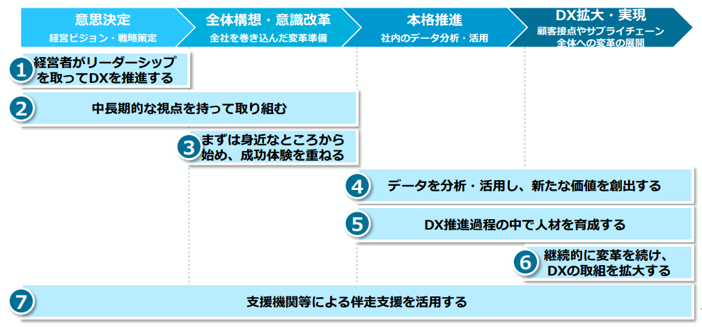 経済産業省では、DXの成功事例を整理し、業種別・段階別に“パターン化”しています。これにより企業は、自社のビジョンや目的に合った成功モデルを選び、具体的な戦略を立案することが可能になります。