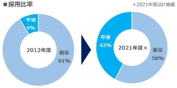 専門性やキャリア志向に応じた柔軟な採用制度を導入したことで、キャリア採用人数はこの10年間で約10倍に増加しました。