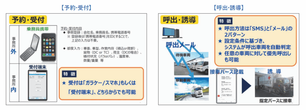 この課題に対して、同社は「バース予約・受付システム」を自社開発し、導入しました。ドライバーは携帯電話からバースの予約や受付ができ、順番が近づくとSMSやメールで呼び出される仕組みです。