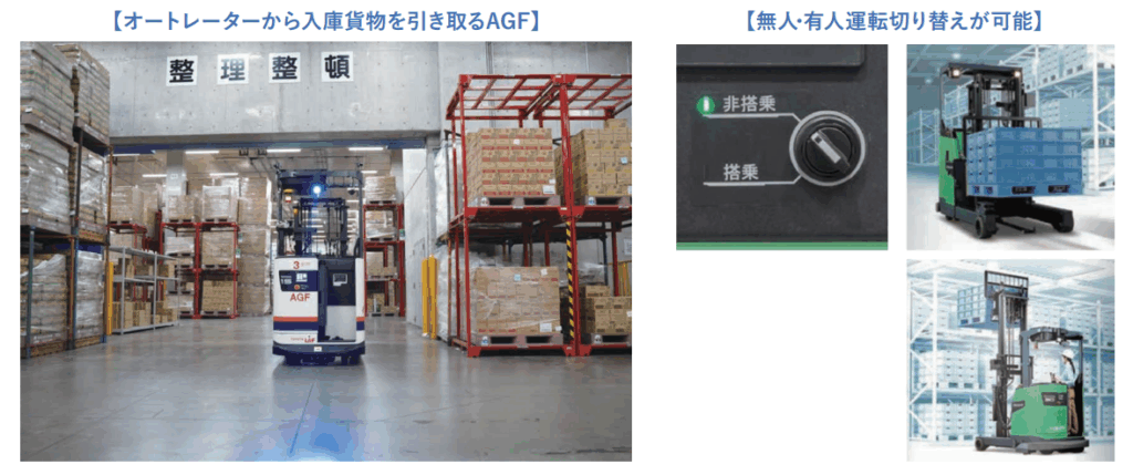 この課題に対して同社は、自動フォークリフト(AGF)とオートレーター(自動垂直昇降機)を連携させた仕組みを導入しました。