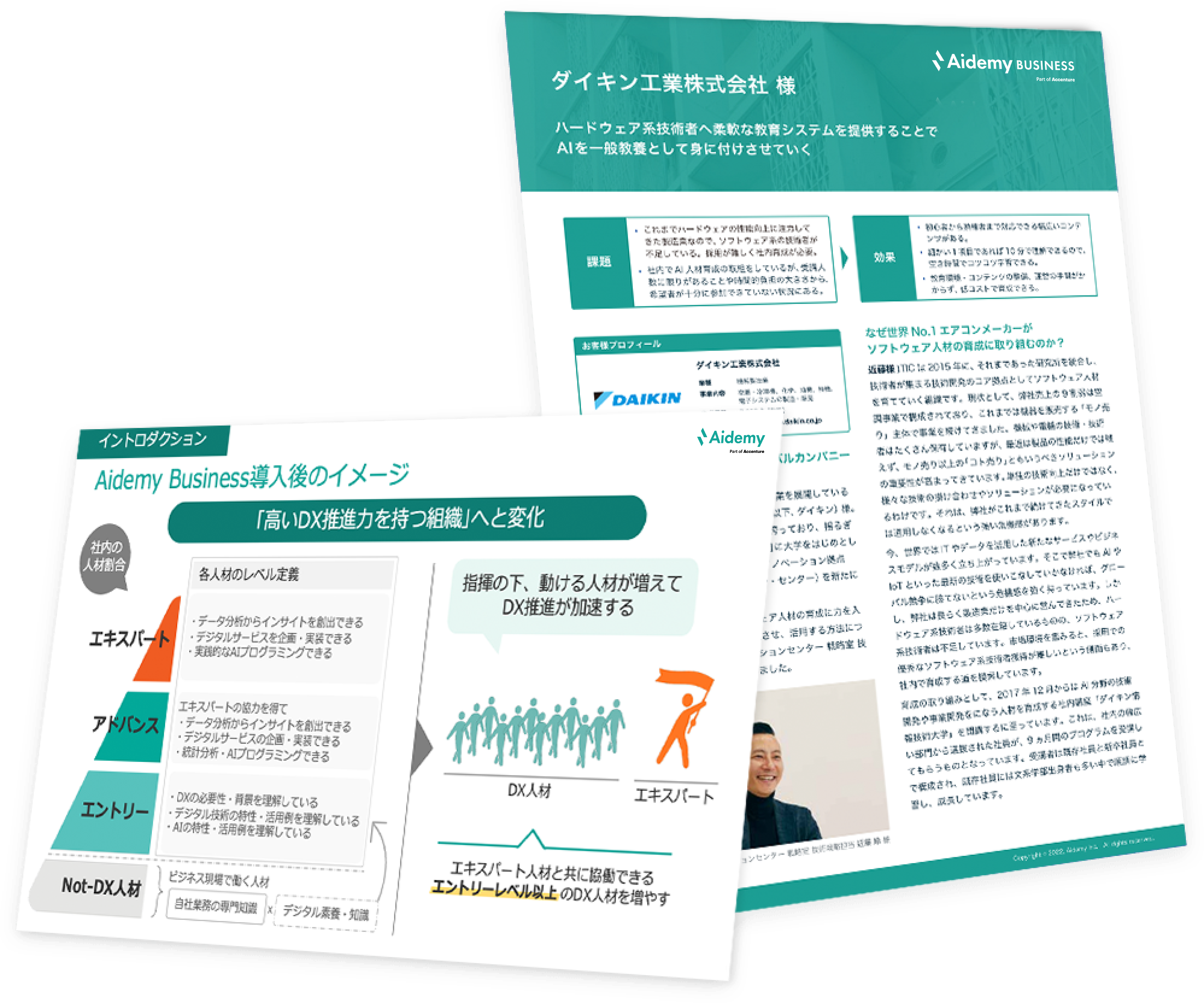 サービスの概要をご覧いただける 「Aidemy Business サービス紹介資料」、 導入された企業様の声、導入効果をご覧いただける 「導入事例資料」をダウンロードいただけます。