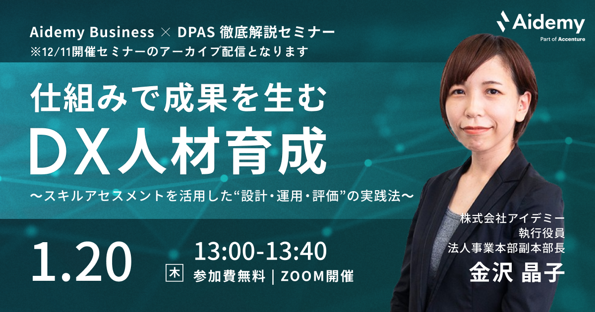 本セミナーでは、DX人材育成を「設計・運用・評価」まで一貫して支える仕組みづくりをテーマに、Aidemy Businessとスキルアセスメントツール「DPAS」を活用した実践的な育成手法を紹介します。